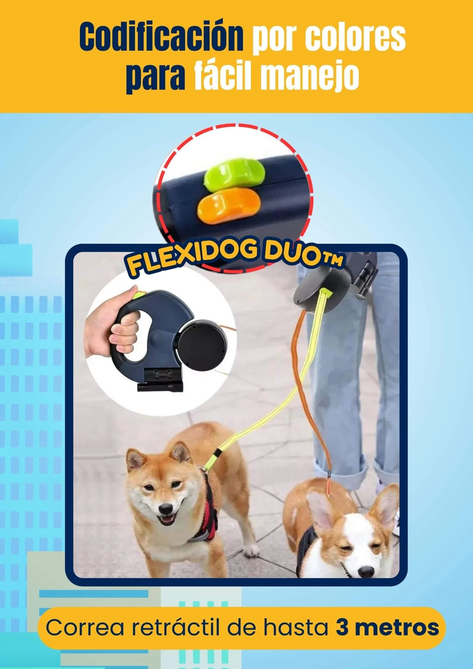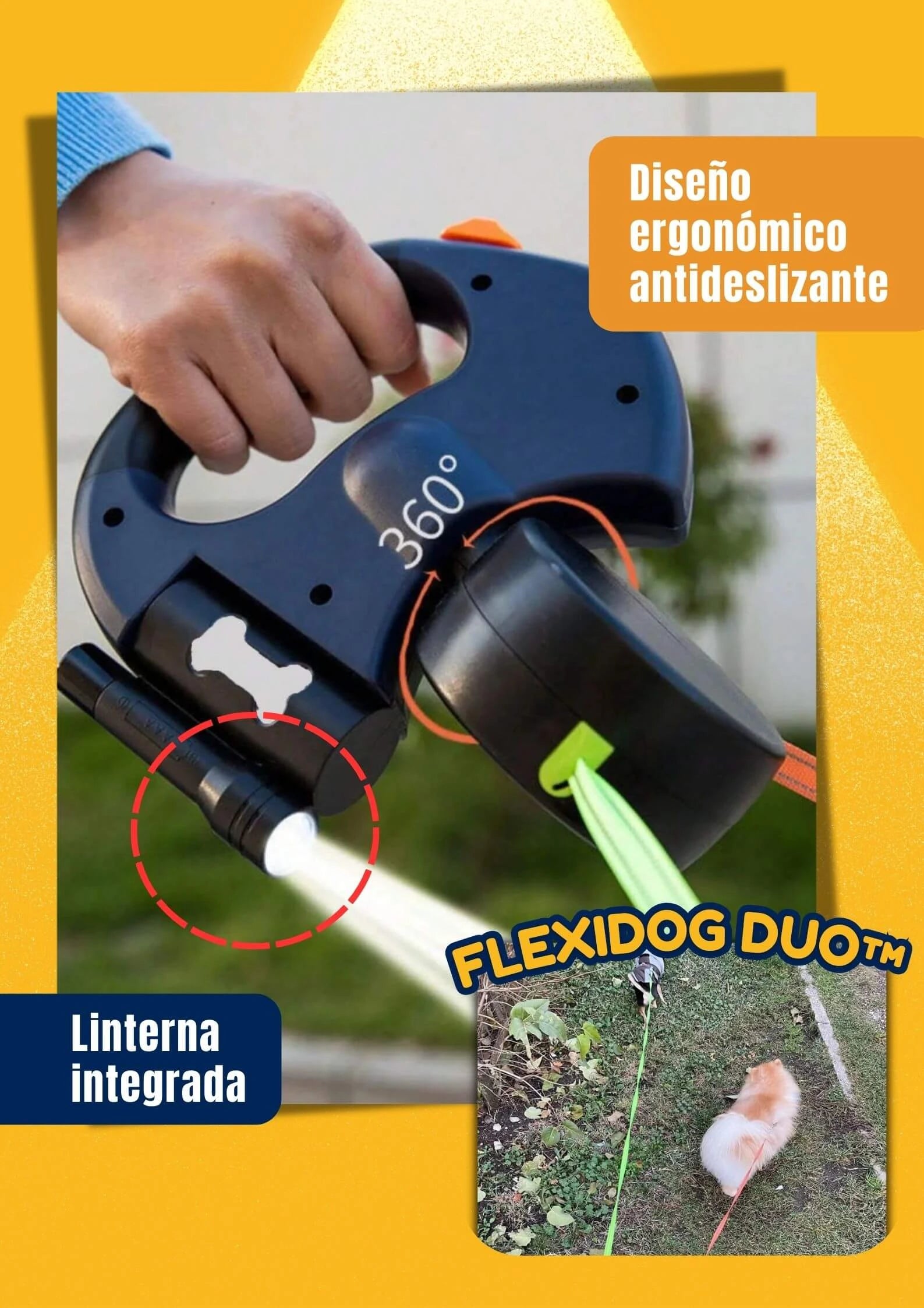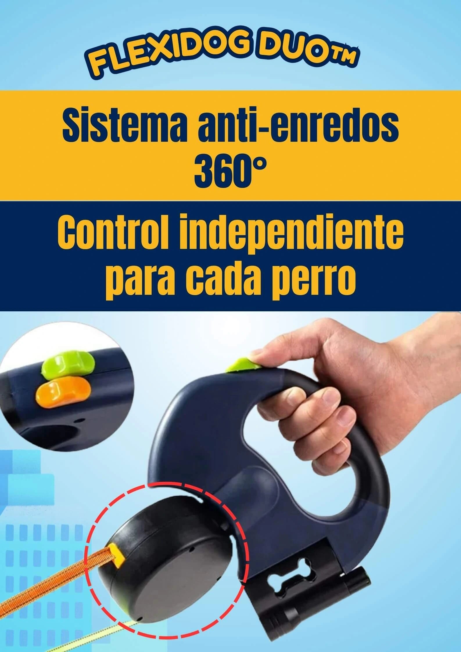FlexiDog Duo™ incorpora un sistema de rotación 360° anti-enredos, botones dobles de control independiente y materiales duraderos con diseño ergonómico, todo en un solo dispositivo compacto.