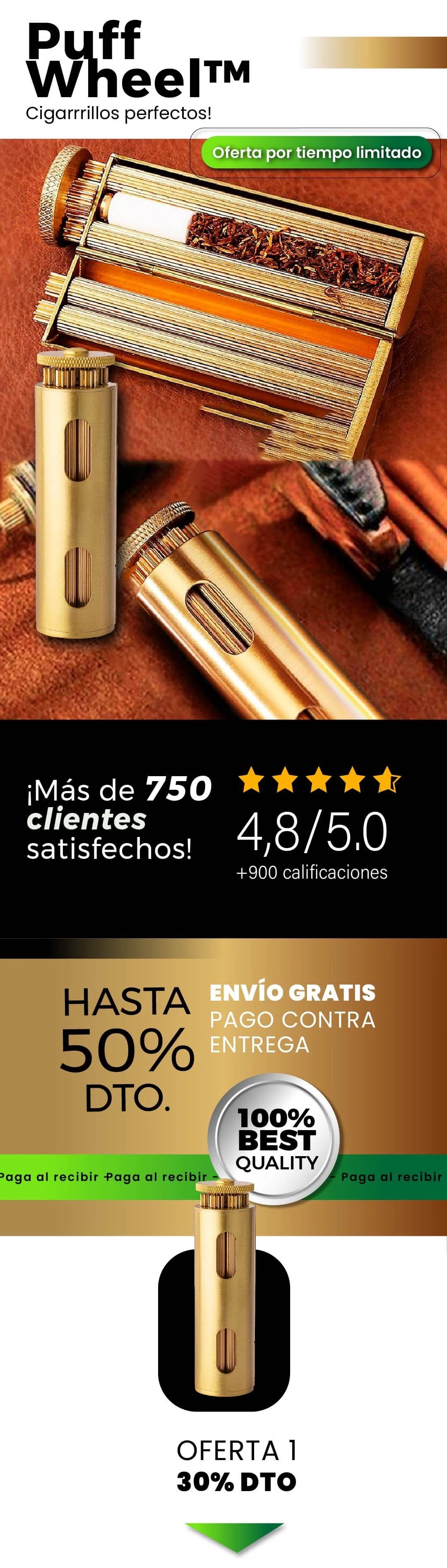 PuffWheel™ es un rodillo artesanal de latón diseñado para enrollar con precisión y estilo hasta 8 piezas, en menos de 5 minutos, así tendrás un pequeño almacén listo para cualquier ocasión. Es ideal para quienes disfrutan un ritual bien hecho, sin el desorden ni la frustración de métodos tradicionales.