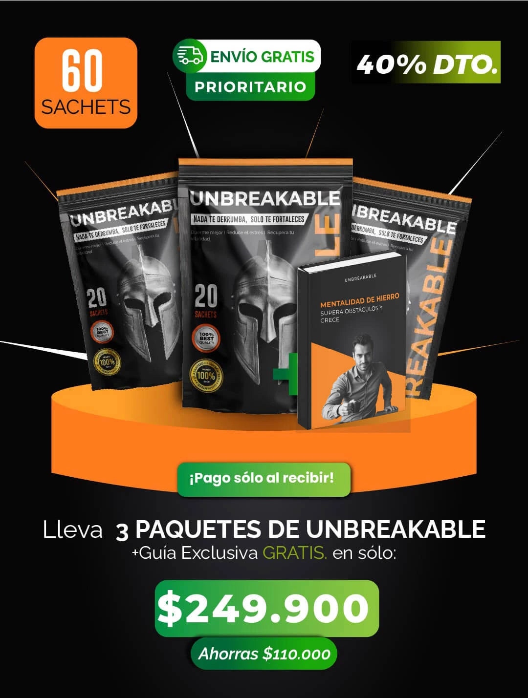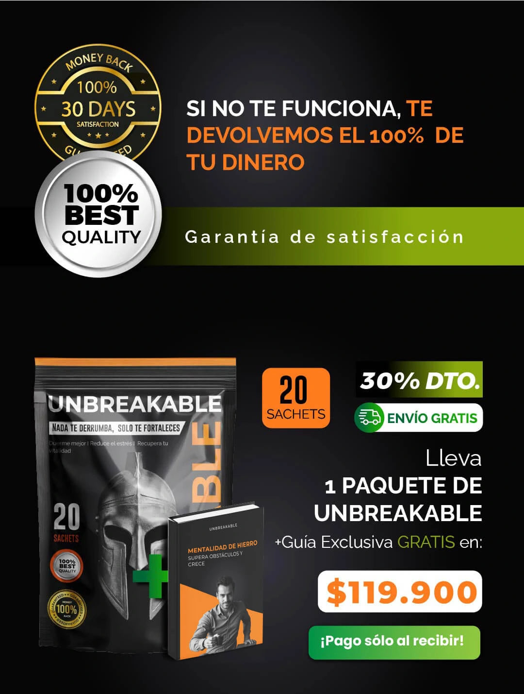 Creemos en la calidad de Unbreakable y por eso ofrecemos una garantía de devolución del 100% de tu dinero. Si en 30 días no notas mejoras, te devolvemos tu inversión sin preguntas. -
